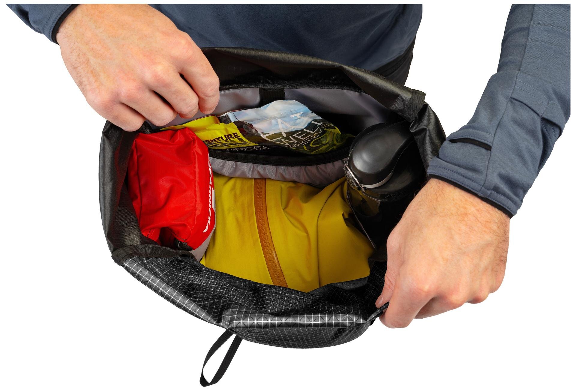 - 24 litre capacity. - Roll top entry – flexible volume and a clean look. - Integrated rain cover with reflective elements. - Air Vent back system and lightweight shoulder straps. - Removable hipbelt with stretch pocket; adjustable sternum strap. - Lid pocket, side compression straps, pole and blinker attachment. - Dual mesh side pockets, internal zipped pocket, two internal side pockets and hydration sleeve.